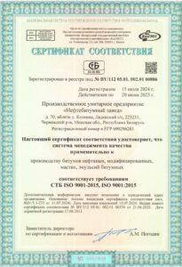 С 2013 года на предприятии сертифицирована система менеджмента качества применительно к производству битумов нефтяных, модифицированных, мастик, эмульсий битумных на соответствие требованиям СТБ ISO 9001-2015, ISO 9001:2015.